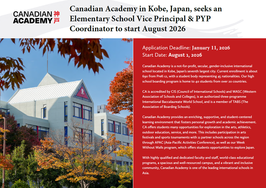The Elementary School Vice Principal and IB PYP Coordinator is a key leadership role within Canadian Academy’s Elementary School, responsible for supporting the academic, social, and emotional development of learners from Early Years through Grade 5.