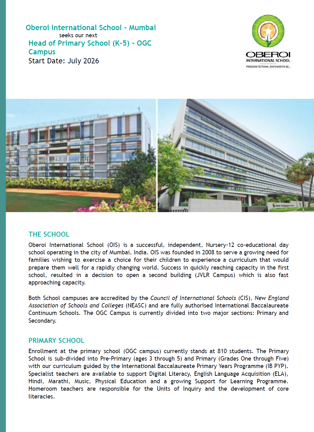Head of Primary School at Oberoi International School - OGC Campus in India