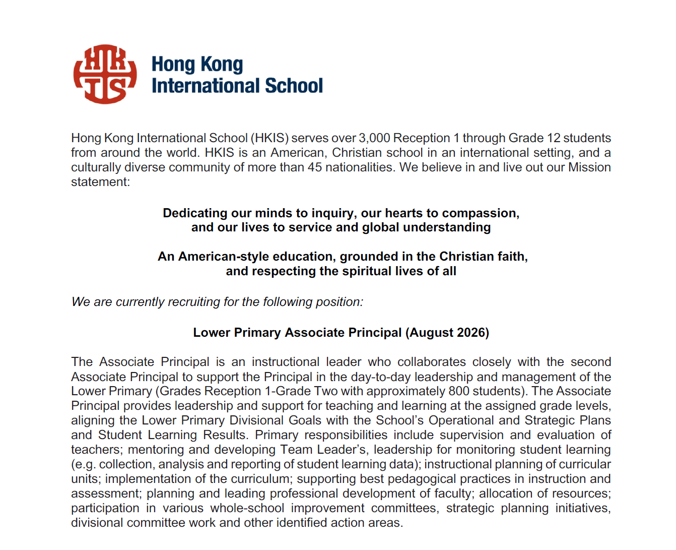 Lower Primary Associate Principal at Hong Kong International School in China/Hong Kong